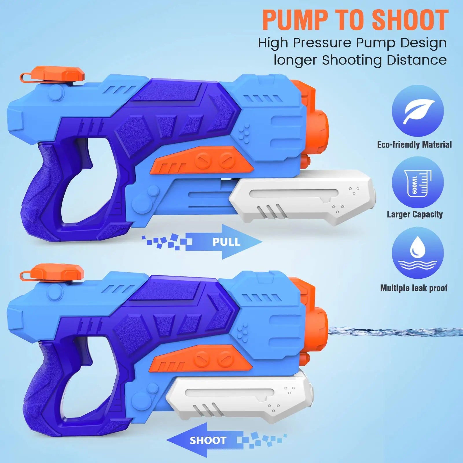 Pressure pumping makes the water gun output faster and it has a longer range distance.
