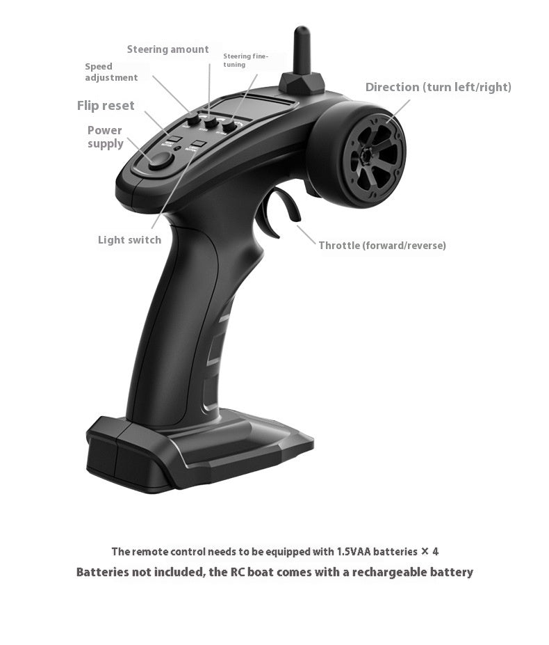 Product features: forward/backward/left/right turn, turbojet drive (safer without exposed propellers), capsizing reset, two-stage low power alarm, lights (can be turned on/off), circulating water cooling structure, steering fine adjustment, throttle control, steering control.