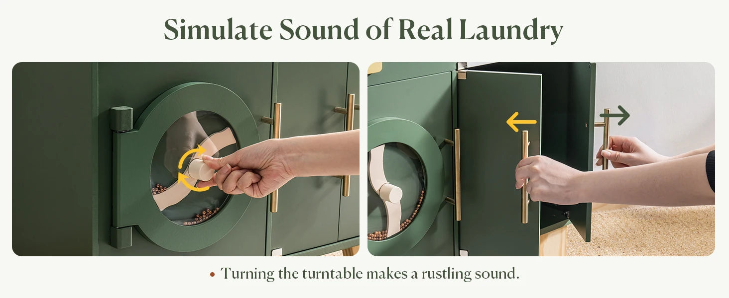 **Interactive Design for Enhanced Play**: The washing machine features a double-door cabinet under the sink, offering ample storage space for organizing toys or laundry accessories. The interior roller design replicates the washing process and produces a realistic rustling sound, adding to the interactive fun.