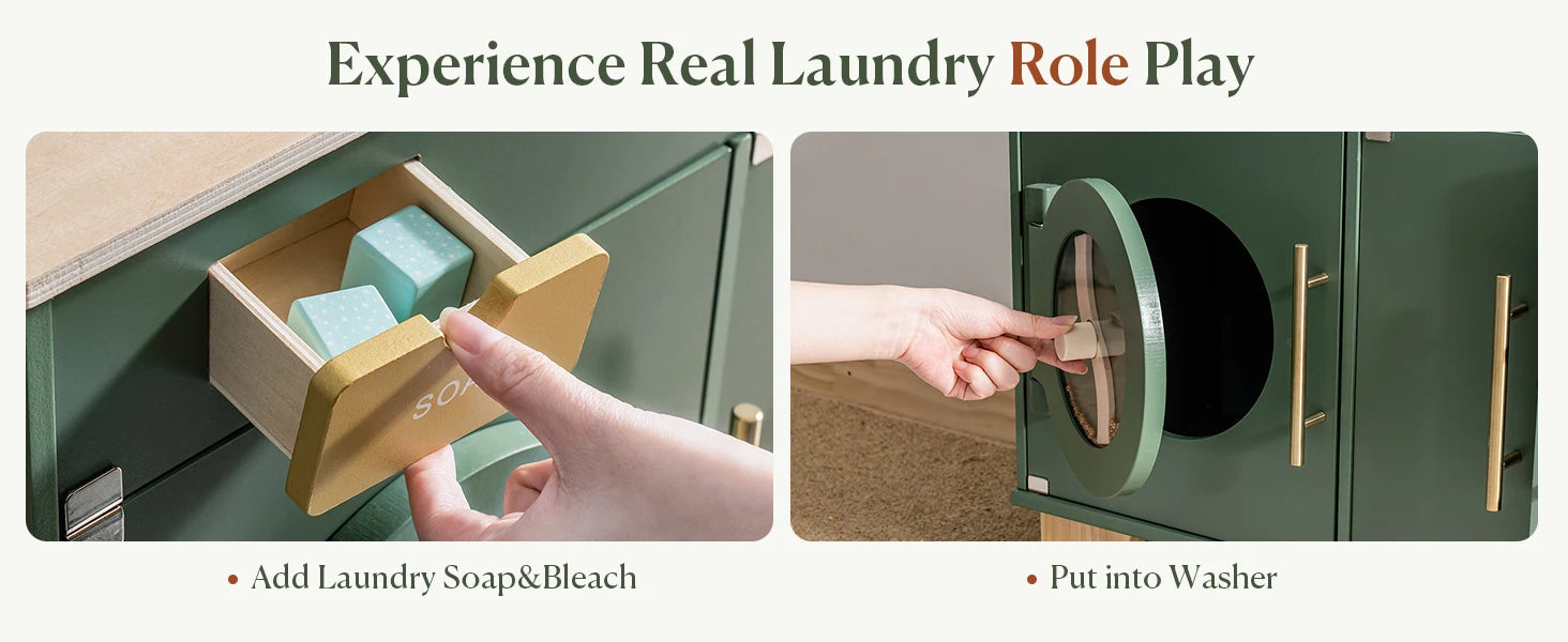 **Versatile Play for Endless Fun**: Our washing machine set comes with an array of engaging accessories, including a wooden bleach bottle, laundry detergent, iron, and two detergent blocks. These elements provide children with a variety of play options and a realistic experience. The specially designed pull-out soap dispenser allows little ones to mimic real laundry tasks, fostering hands-on skills and creativity.
