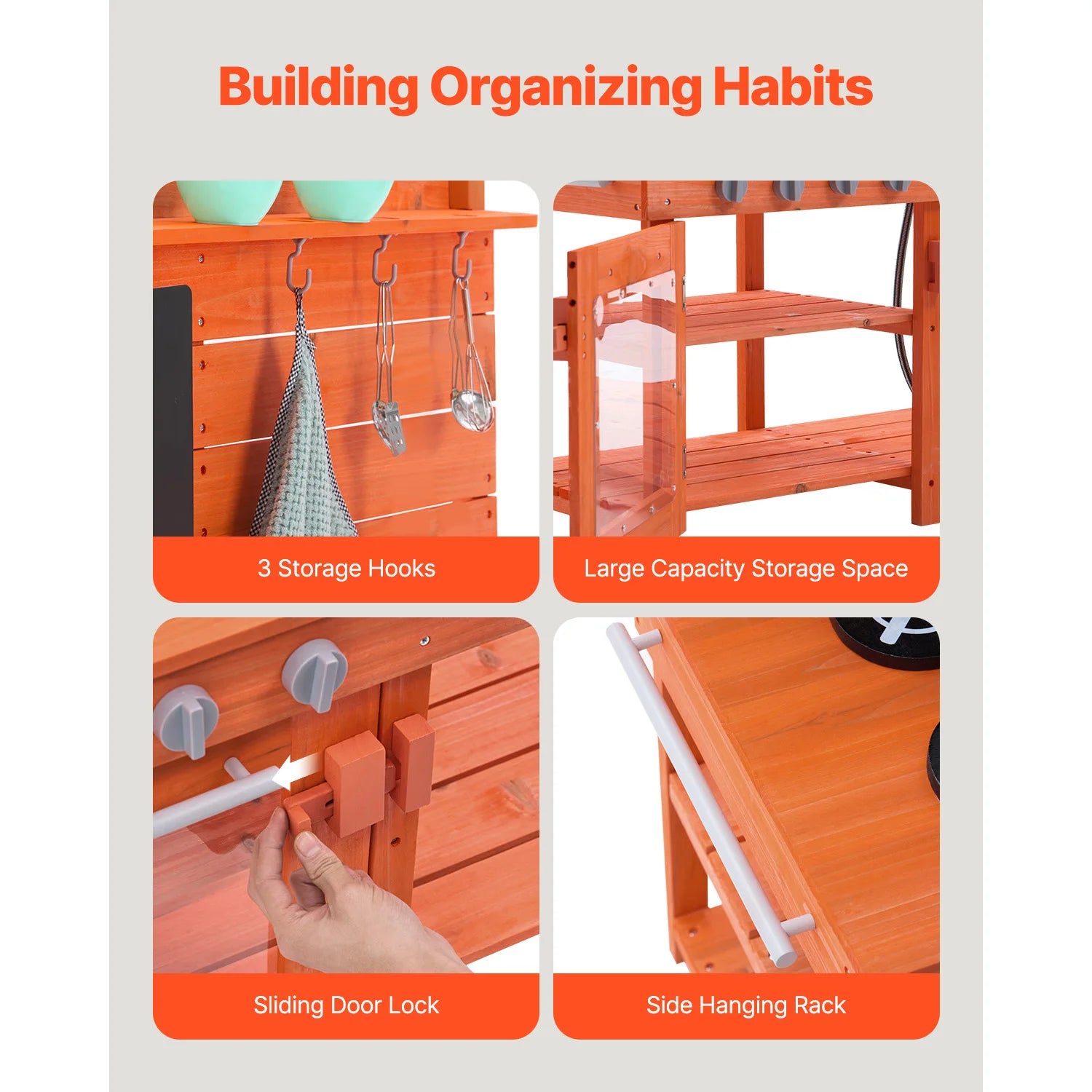A Fun Developmental Gift: This pretend play outdoor kitchen is perfect for birthdays or holiday gifts for children, whether for boys or girls! With a 20.47-inch countertop height, kids can easily reach and organize their play items, helping improve hand-eye coordination. The spacious work area allows children to play with friends, explore the joys of nature outdoors, and improve collaboration and social skills