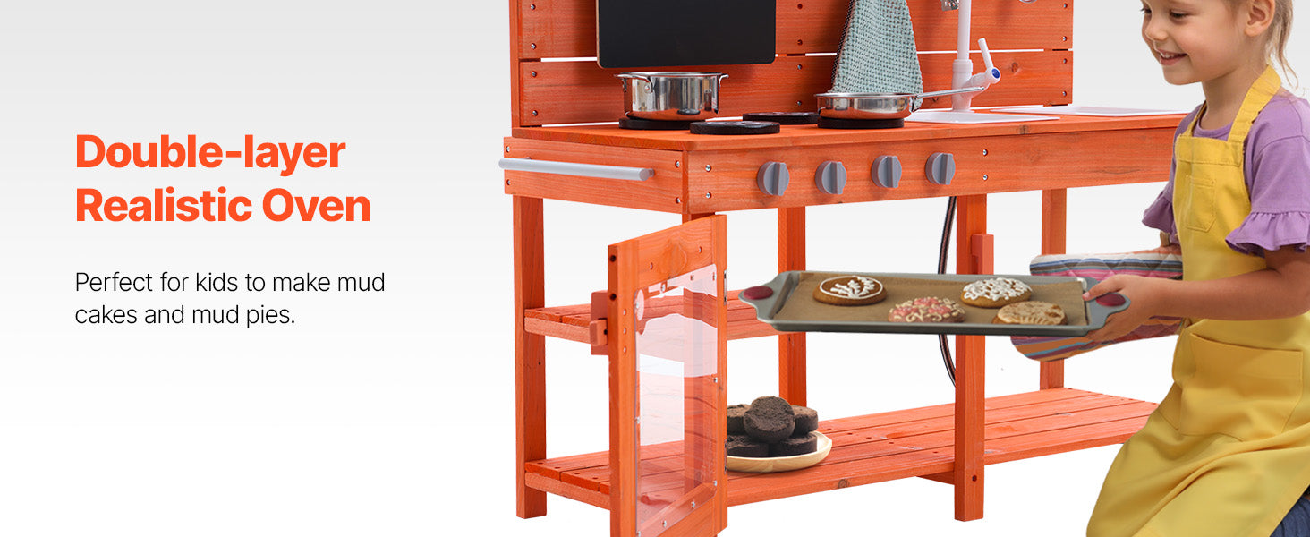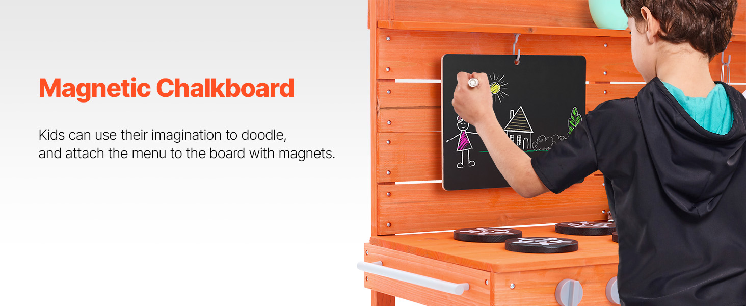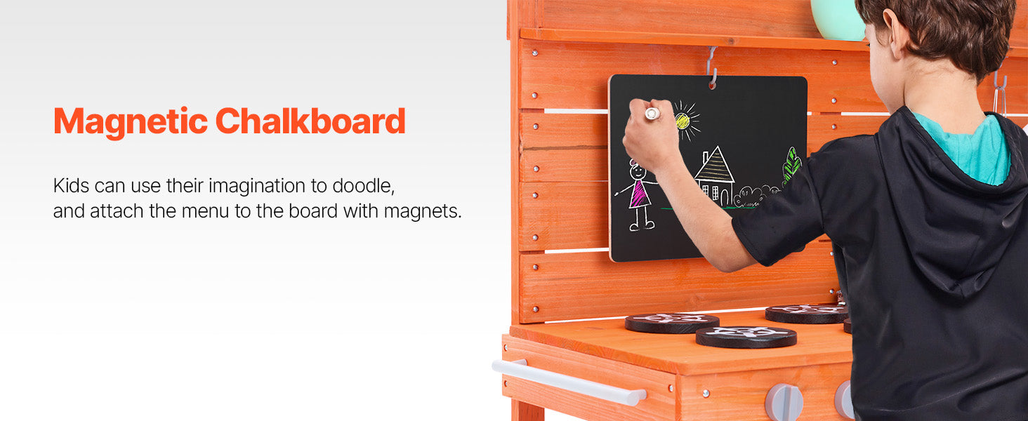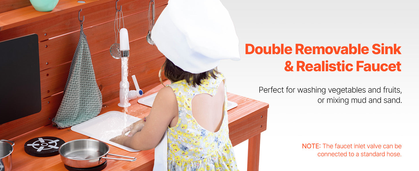 • Realistic Kitchen Play Design: Let your little one imitate cooking with dirt just like a real chef! Little chefs can write and draw menus on the magnetic chalkboard, use the two removable sinks and pull-out faucet to clean up their "dishes" (the faucet is compatible with a standard garden hose), and turn the knobs on the simulated stove to start cooking. They can even bake "mud pies" in the dual-layer oven! After play, they can easily clean the surface with the pull-out faucet